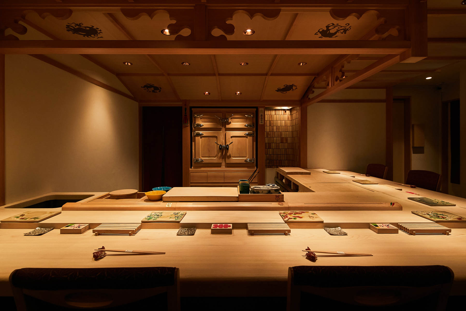 Even in the high-end neighborhood of Minami Azabu, the elegant and inviting Sushi Yoshida storefront stands out. The entrance is elegantly adorned with a restaurant signboard penned by a friend and standing paper lanterns, and as you approach the sliding door, you will notice the small metal handle is in the shape of an auspicious gourd.